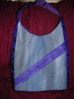 May brought about not only Mother's Day, but also a birthday, and so I made items to celebrate both occasions. First up is a bag that I made for my mother, using the same pattern I've been using since last summer (this is the fifth bag I've made with it, I rather like it!). I picked out handpainted fabrics at the Sewing Expo in March, selecting a light purple with a silver sheen and swirly pattern as well as a shades of gray with silver and a raindrops pattern. Rather than just doing one side of each color, I used a strip of each one to slash the opposite fabric, and cut my pieces from those.